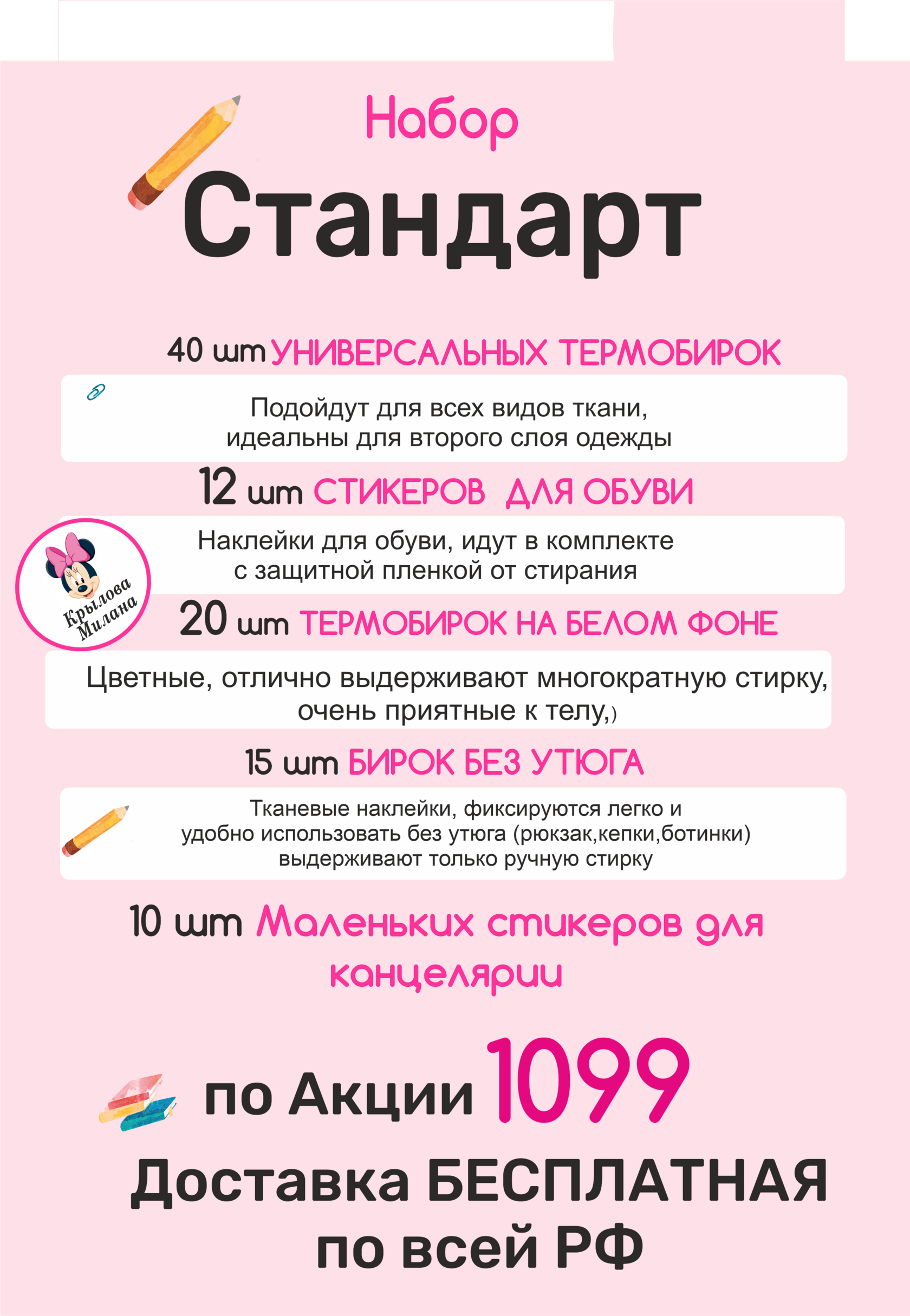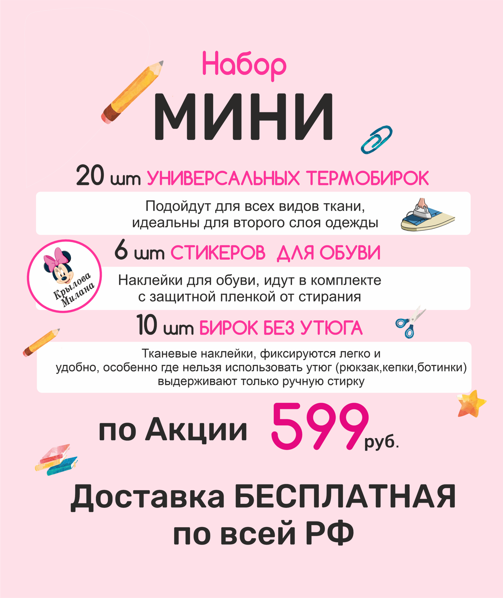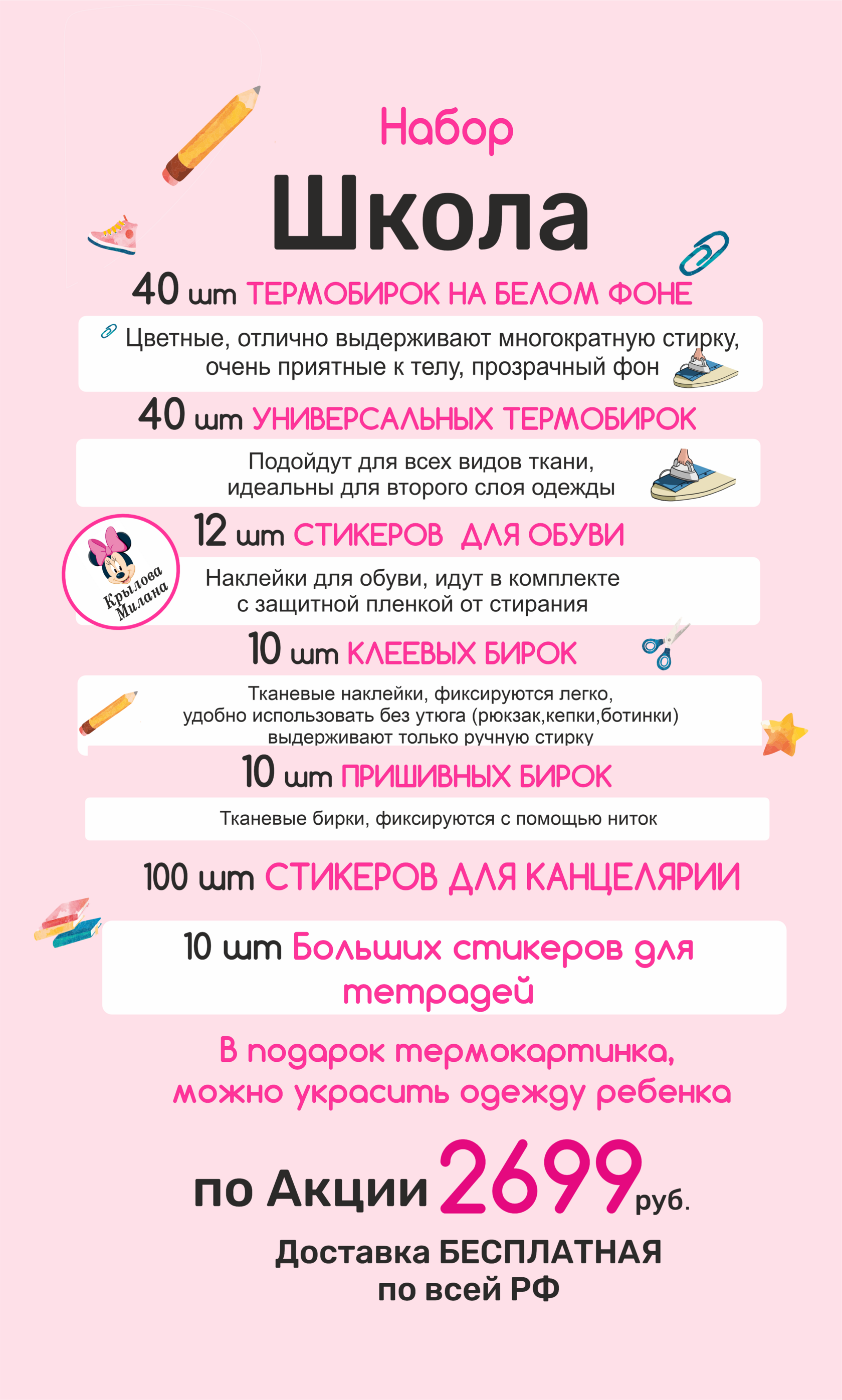 Входит: 40 Суперстойких термобирок Отлично выдерживают стирку, не чувствуются на ткани 40 шт термобирок для второго слоя одежды ( идеальны для всех видов ткани, более плотные чем для первого слоя) 12 шт стикеров для обуви с защитной пленкой 10 шт клеевых бирок Тканевые бирки на клеевой основе, фиксация без утюга 100 шт стикеров для канцелярии 10 шт стикеров для тетрадей 10 пришивных бирок Термопринт для одежды в подарок Бесплатная доставка по РФ