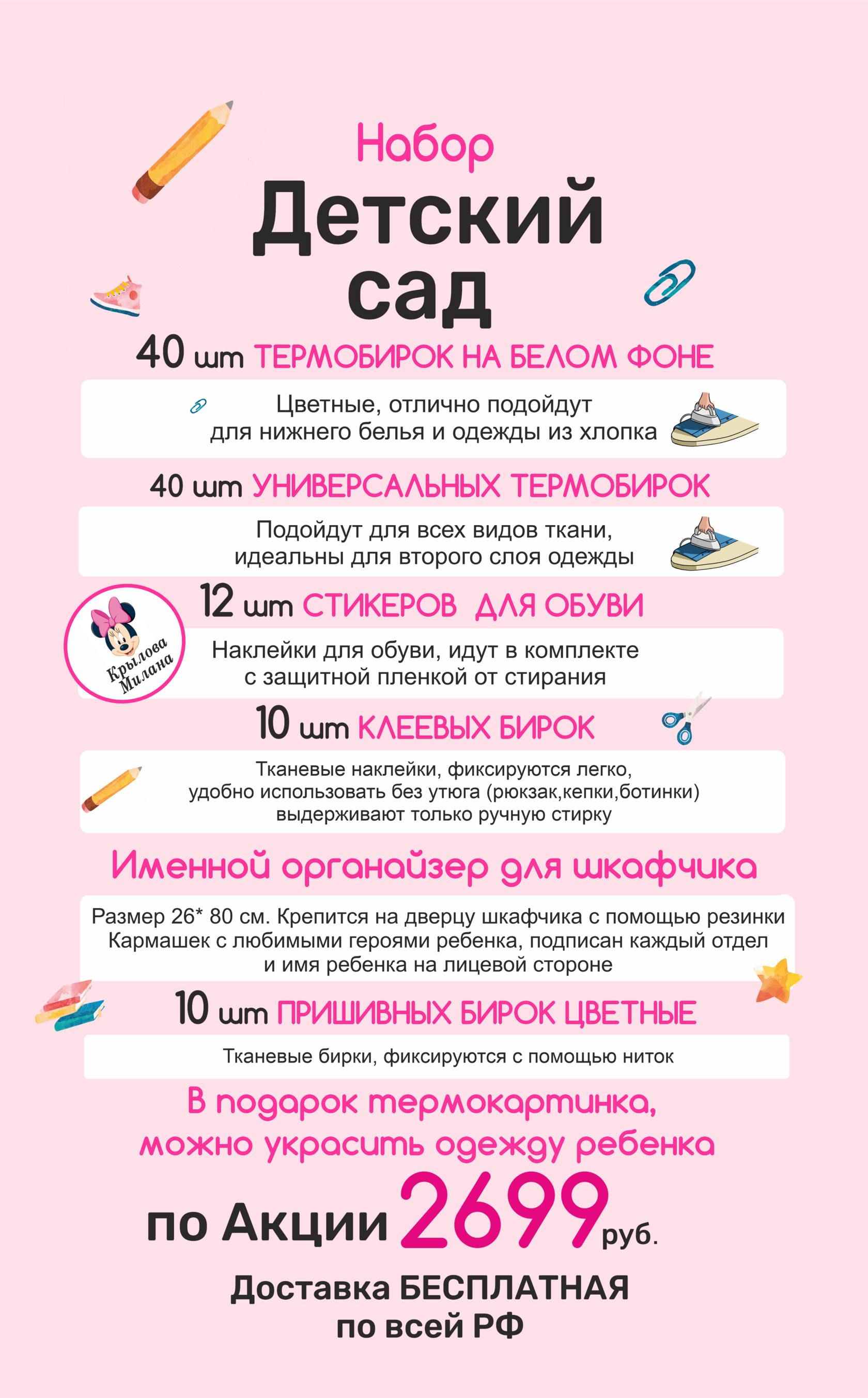 Входит: 40 ТЕРМОБИРОК на БЕЛОМ ФОНЕ Отлично выдерживают стирку, не чувствуются на ткани 40 шт термобирок для второго слоя одежды ( идеальны для всех видов ткани, более плотные чем для первого слоя) 12 шт стикеров для обуви с защитной пленкой 10 шт клеевых бирок Тканевые бирки на клеевой основе, фиксация без утюга Именной кармашек для шкафчика 10 пришивных бирок Термопринт для одежды в подарок Бесплатная доставка по РФ